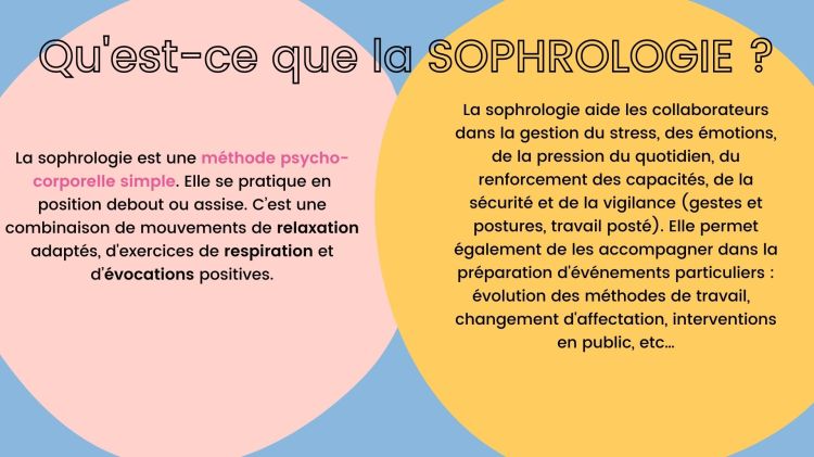 La sophrologie est une méthode psycho-corporelle utilisant des exercices de respiration, des mouvements de relaxation et des évocations mentales positives pour tendre vers l’harmonie du corps et de l’esprit. Elle permet de trouver un équilibre de vie.